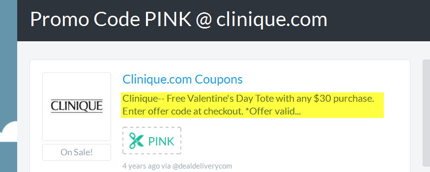 Clinique.com Free Valentines’ tote on affiliate coupon site example: