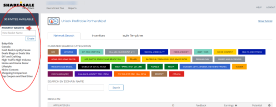 Step 4: Search and curate ShareASale’s listed categories for your ideal target prospects. Each affiliate in the network is organized into a category. Click on the category tag to browse, and select the appropriate recruitment basket for each targeted prospect you want to invite to your program.