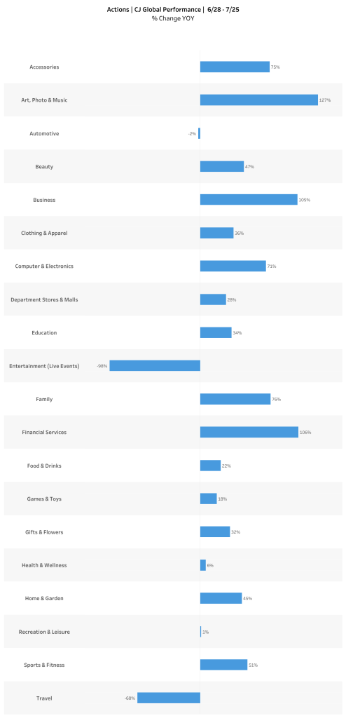 According to CJ’s network data, Financial Services, Business, Art/Photo/Music category merchants have seen north of a 100% increase in YoY sales. Computer Electronics and Family about 75% YoY. Sports+Fitness, Home+Garden, and Beauty about 50% YoY.
